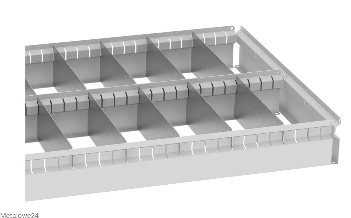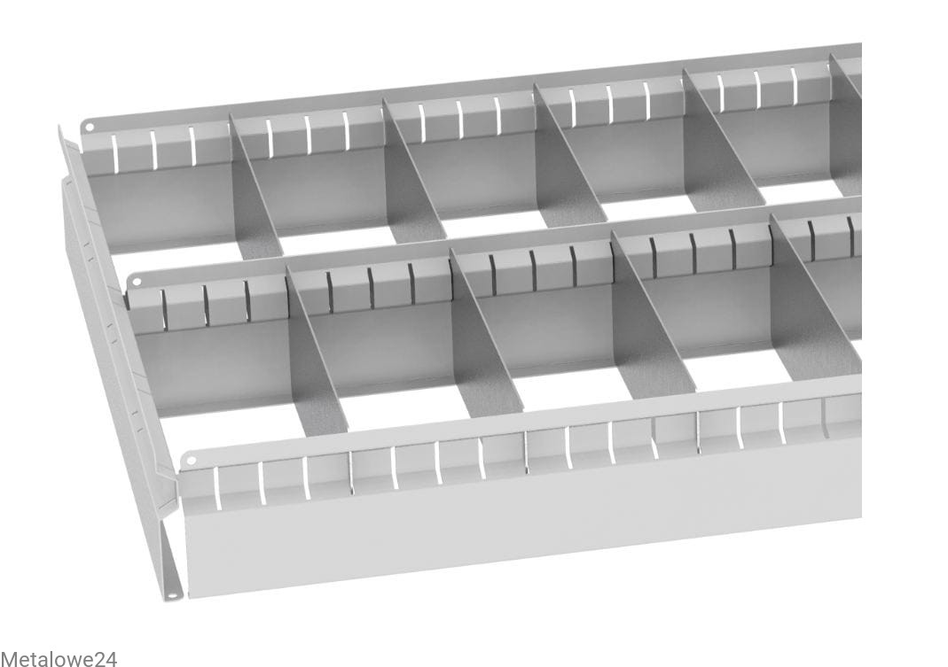 Metalowy podzielnik, wkład szuflady do szuflad szaf metalowych serii "Heavy" o szer. 100 cm. Ramka malowana proszkowo, przegródki ocynkowane. Podzielnik posiada 2 komory + 18 ruchomych ocynkowanych przegródek. Dedykowany jako wyposażenie dodatkowa do szuflad szaf z serii "Heavy".