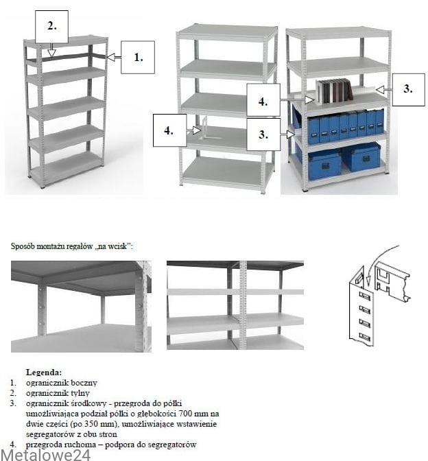 Szkielet regału wykonany jest z blachy stalowej gr. 1,5 mm składany na "wcisk". Półki wykonane są z blachy stalowej gr. 0,8 mm, przestawne co 30 mm. Wzdłużnice i poprzeczki malowane są na taki kolor jak półki, tak samo jest w przypadku wybrania akcesoriów dodatkowych (ograniczniki, przegrody). Wszystkie elementy metalowe malowane są (ekologicznymi farbami proszkowymi) na kolor wybrany przez klienta. Regał do samodzielnego montażu.