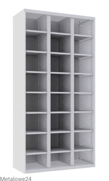 Regał wykonany z blachy stalowej o gr. 0,8-1,0 mm. Ciągła perforacja na całej wysokości pozwala w łatwy sposób regulować wys. półek co 25 mm. Wielkość przegródek dostosowana do formatu A4. W zestawie 21 półek w trzech pionach. Wymiar półki: szer. 314 mm, gł. 417 mm, wys. 20 mm.