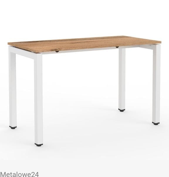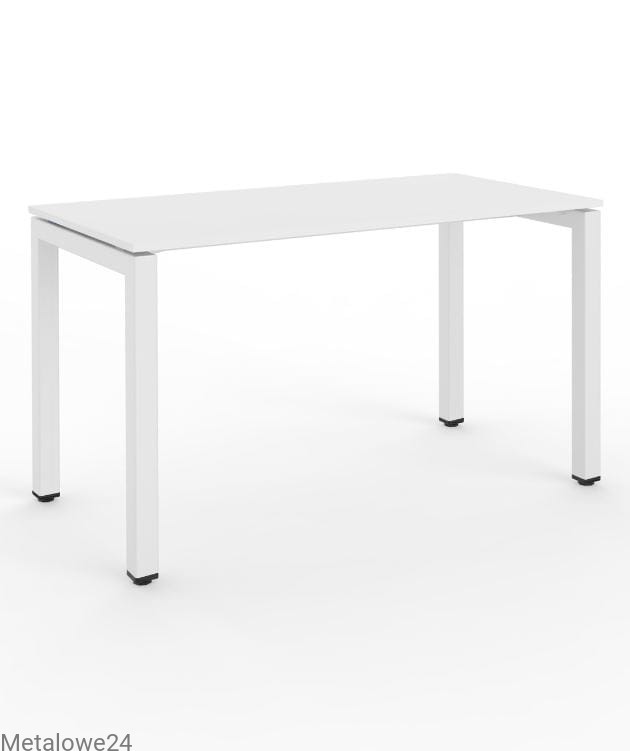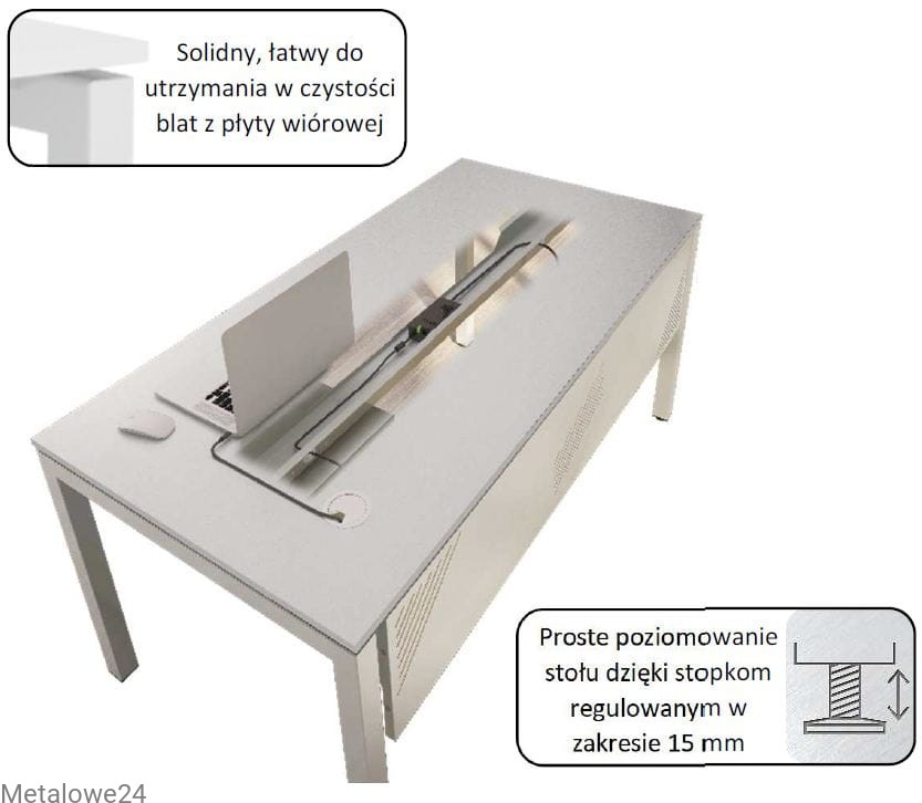 Prostokątny stół biurowy. Nogi stołu wykonane ze stalowych profili o profilu kwadratowym 50 x 50 mm wyposażone w stopki wyrównujące wysokość. Wyposażony w kanał kablowy umieszczony pod blatem umożliwiający w estetyczny sposób przechowanie kabli lub listwy zasilającej.