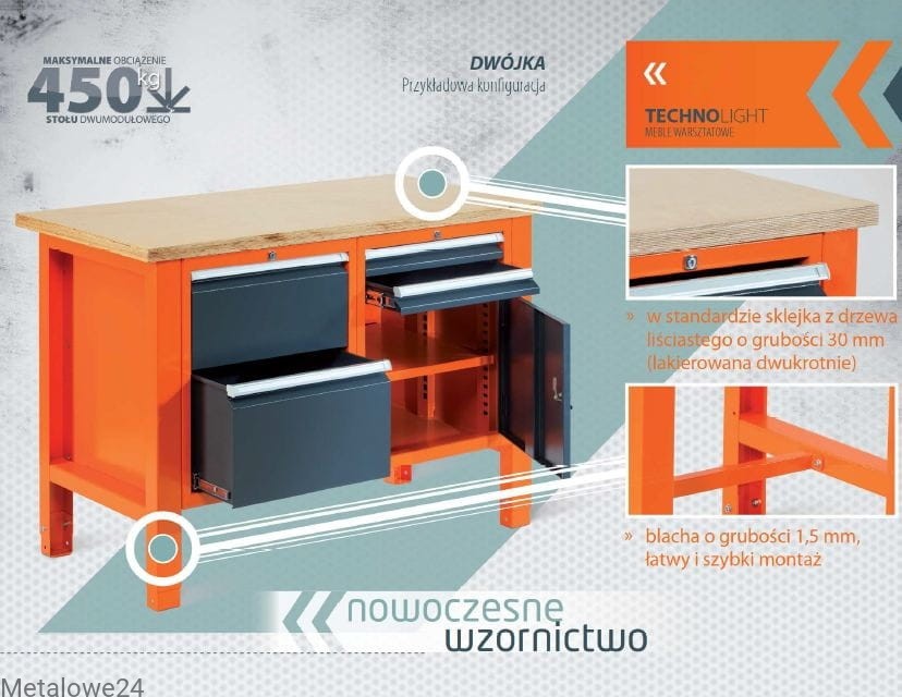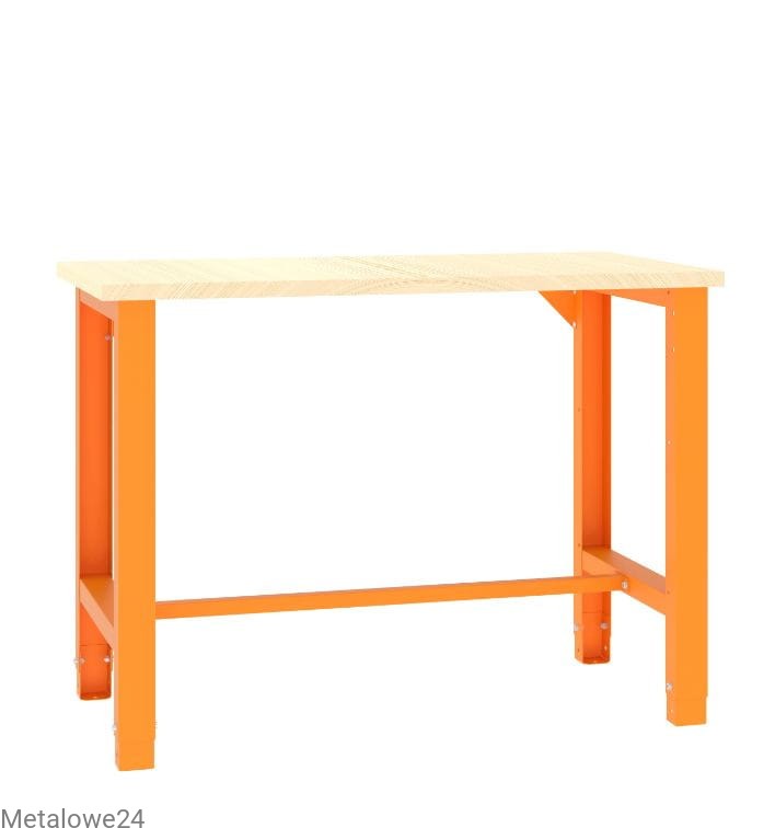 Stelaż wykonany z blachy stalowej o gr. 1,5 mm (stelaż wraz z kątownikami wzmacniającymi). Dopuszczalne maksymalne obciążenie stołu - do 450 kg. Standardowo oferujemy blat ze sklejki z drzewa liściastego o gr. 30 mm (lakierowany dwukrotnie). Wymiary blatu: szer. 124,5 cm, gł. 62 cm, wys. 3 cm. Blat posiada nawiercone otwory do przykręcania. Nogi z regulacją wysokości: 85 - 90 cm. Stół do samodzielnego montażu (łatwy i szybki montaż).