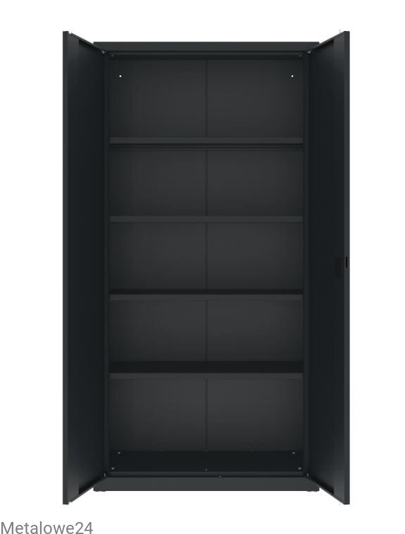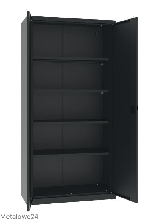 Stabilna szafa metalowa wykonana z blachy stalowej o gr. 0,7 mm. Drzwi skrzydłowe ze schowanymi zawiasami - uchwyt drzwiowy Ronis z zamkiem zabezpieczającym w 2 pkt. W szafie 4 półki przestawne co 25 mm, dostosowane do teczek zawieszkowych. Dopuszczalne obciążenie półek – do 65 kg.