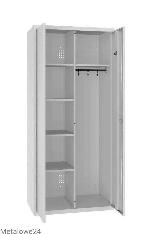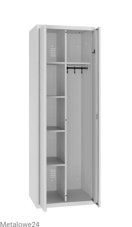 Szafa gospodarcza Smd 61 jest wyposażona wewnątrz lewego segmentu w 4 półki, wewnątrz prawego segmentu w górną półkę i poniżej w drążek z 3 przesuwanymi wieszakami na ubrania. Szafka zamykana zamkiem cylindrycznym z ryglowaniem w 2 pkt. Szafa gospodarcza do zastosowań dowolnych. Korpus wykonany z blachy o gr. 0,6-0,8 mm, drzwi i półki o gr. 0,6 mm. Szafy posiadają otwory w ścianach bocznych i ścianie tylnej do łączenia ze sobą.