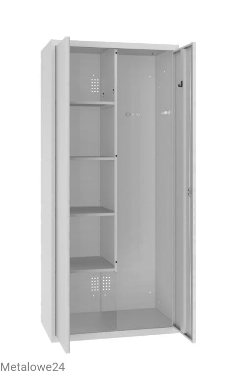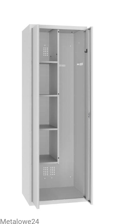 Szafa gospodarcza Smd 62 wyposażona wewnątrz lewego segmentu w 4 półki. Prawy segment służy do przechowywania szczotek, mopa i innych narzędzi do sprzątania. Brak ścianki rozdzielającej na dole szafki pozwala na włożenie np. wiadra. Szafa zamykana zamkiem cylindrycznym z ryglowaniem w 2 pkt. Korpus wykonany z blachy o gr. 0,6-0,8 mm, drzwi i półki o gr. 0,6 mm. Szafy posiadają otwory w ścianach bocznych i ścianie tylnej do łączenia ze sobą.