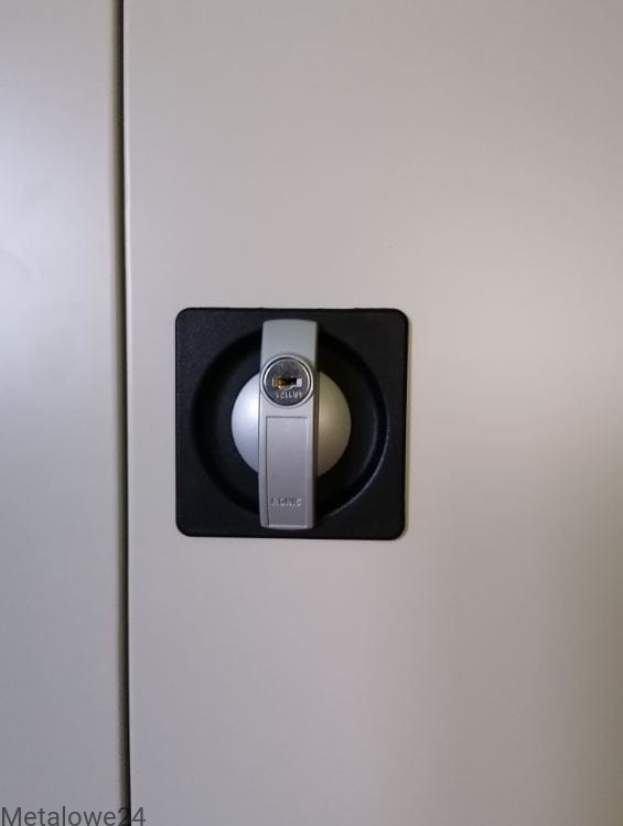 Stabilna szafa metalowa wykonana z blachy stalowej o gr. 0,7 mm. Drzwi skrzydłowe ze schowanymi zawiasami - uchwyt drzwiowy Ronis z zamkiem zabezpieczającym w 2 pkt. W szafie 4 półki przestawne co 25 mm, dostosowane do teczek zawieszkowych. Dopuszczalne obciążenie półek – do 65 kg.