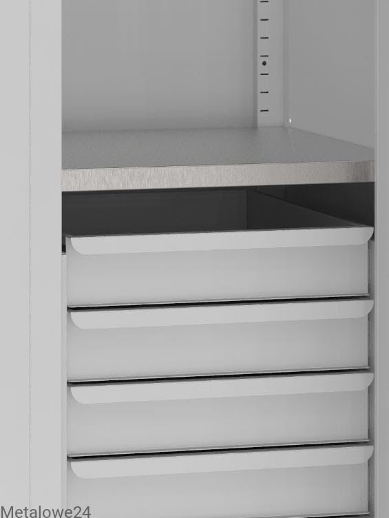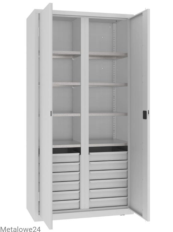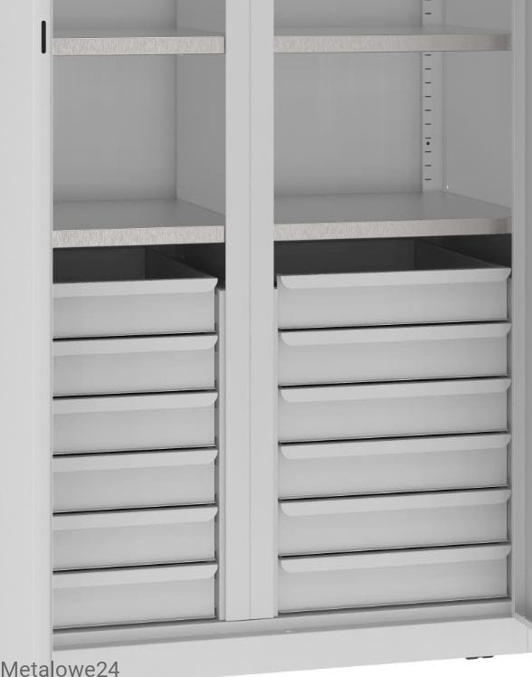 Szafa narzędziowa dzielona z przestawnymi półkami i szufladami to idealny mebel do warsztatu, narzędziowni i garażu. Pozwala na przechowywanie w jednym miejscu narzędzi i urządzeń oraz drobnych akcesoriów w sposób posegregowany. Optymalne porozmieszczanie półek sprawia, że w szafie znajdą swoje miejsce większe i mniejsze narzędzia. Ujednolicona głębokość to opcja stworzenia ciągów meblowych z innymi szafami narzędziowymi.