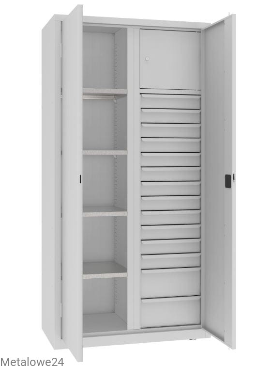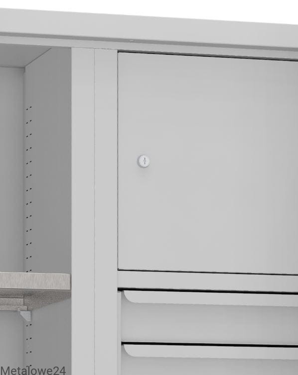 Funkcjonalna mocna szafa narzędziowa ze schowkiem, przestawnymi półkami i szufladami. Niezastąpiona w każdym warsztacie, garażu, magazynie lub majsterkowni. Ocynkowane przestawne półki to dobre miejsce na różnego typu narzędzia, urządzenia. Szuflady natomiast to doskonałe miejsce do posegregowanego przechowywania drobnych przedmiotów. A schowek - skrytka to dodatkowe zabezpieczenie, gdy z szafy korzysta więcej osób.