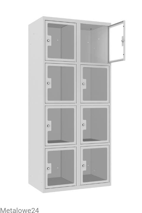 Podwójna (szer. 2x40 cm) szafa socjalna Sus 424 to 8 przedziałów z drzwiami z szybą pleksi. Dedykowana do urządzania pracowniczych pomieszczeń socjalnych, do meblowania szatni szkolnych, a także do użytku domowego. Jako opcję dodatkową oferujemy różnego typu podstawy zwykłe i z ławką stałą lub wysuwaną (listwy z drewna lub PCV). Modułowa budowa to możliwość połączenia w ciągi meblowe z szafami ubraniowymi lub skrytkowymi.