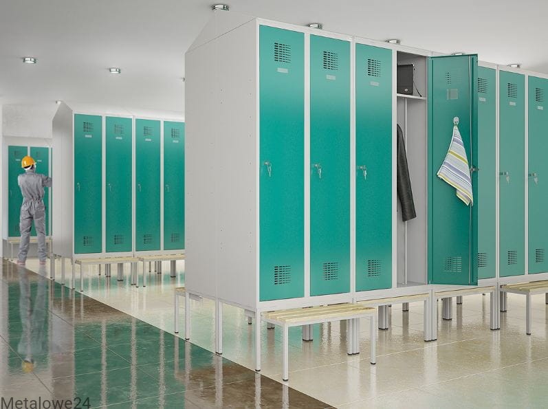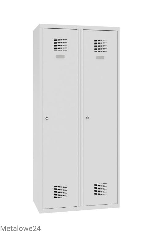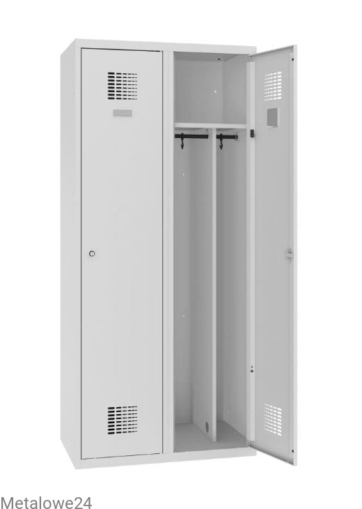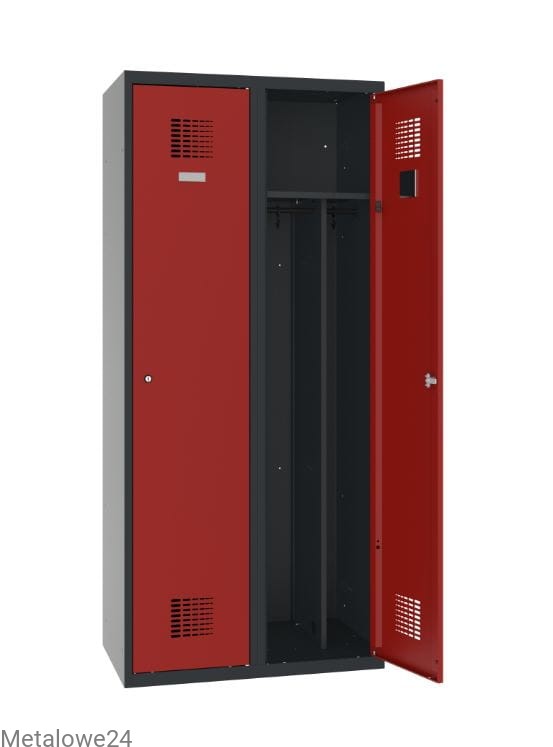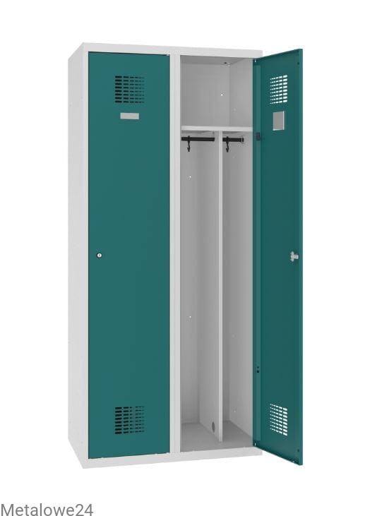 Dwudrzwiowa metalowa szafa ubraniowa Sum 420 W z pionową przegrodą na oddzielenie odzieży czystej od brudnej. Dwa niezależnie zamykane na klucz moduły dają swobodny dostęp dwóm użytkownikom. Szafka dedykowana do pomieszczeń socjalnych w miejscu pracy, ale również do szatni w szkole i innych miejsc użyteczności publicznej. Szafa do ustawia bezpośrednio na podłodze lub dedykowanej podstawie z ławką stałą lub wysuwaną.