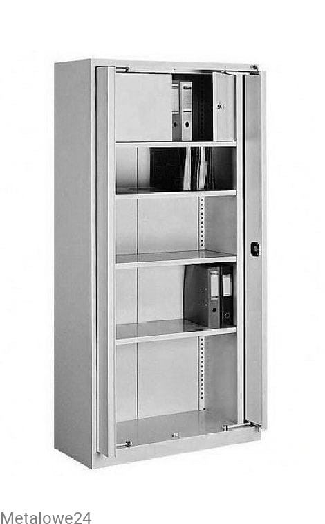Szafa wykonana z blachy stalowej o gr. 0,7 mm. Drzwi chowane w podwójne boki szafy, co znacznie zmniejsza przestrzeń potrzebną do jej otwarcia. Uchwyt drzwiowy z zamkiem na klucz (2 klucze w komplecie). Szafa wyposażona w 3 półki przestawne co 25 mm i dwukomorową zamykaną skrytkę.