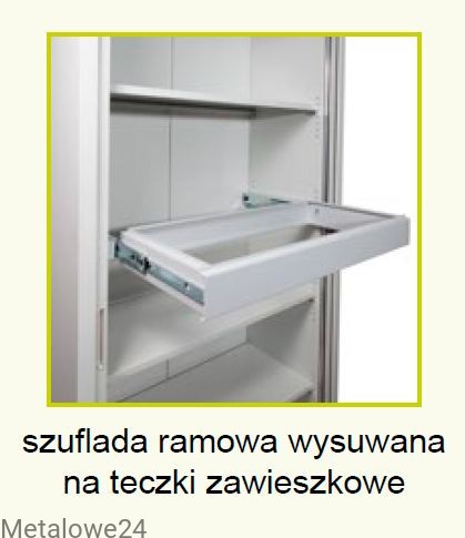 Szuflada ramowa na teczki zawieszkowe do szaf z drzwiami żaluzjowymi i chowanymi o szer. 100 cm. Wykonana z blachy stalowej o gr. 1,5 mm. Wysuwana na prowadnicach kulkowych poza obrys szafy.